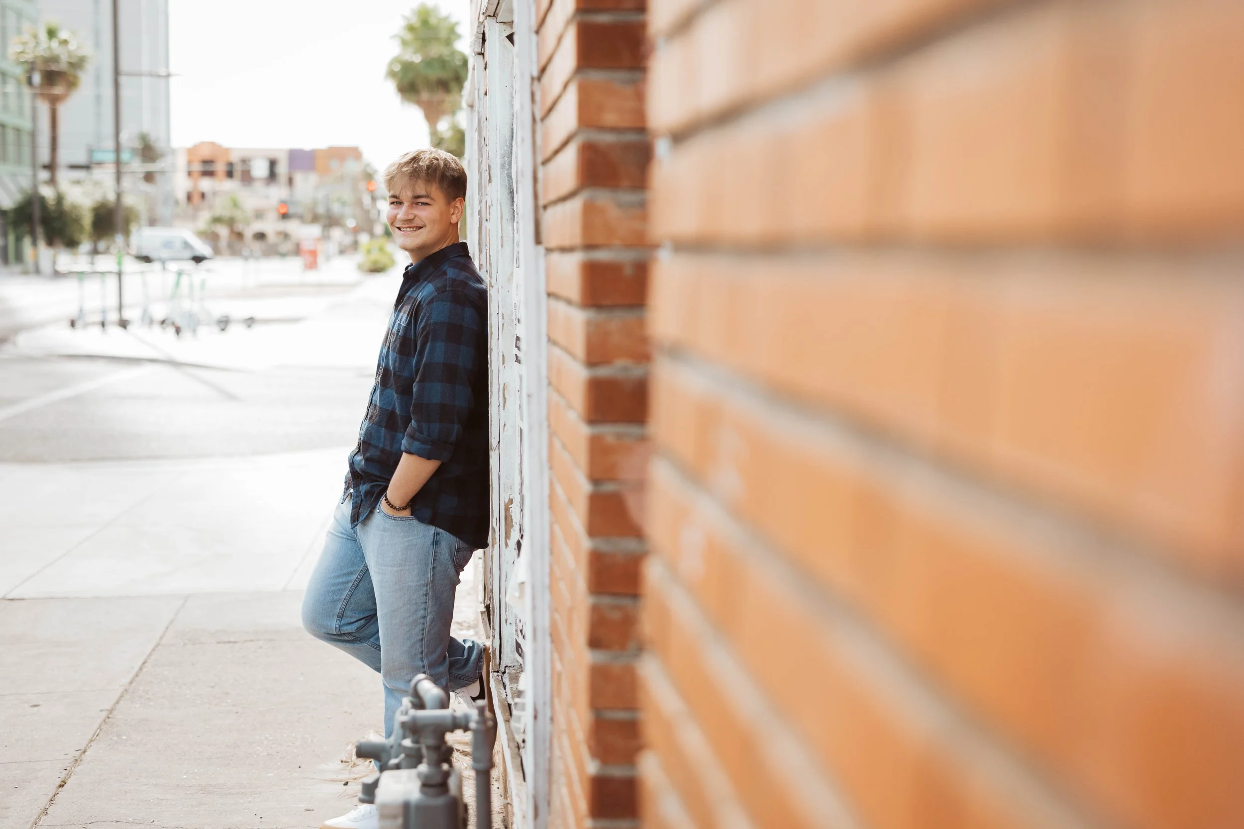 For his session, we headed into downtown Phoenix, which is genuinely one of my favorite places to shoot seniors. The textures, the light bouncing off buildings, the little hidden corners that most people walk right past, it gives you so much to work with! It doesn't feel like a typical "senior session" backdrop, which I think is exactly why it works so well for the right person.