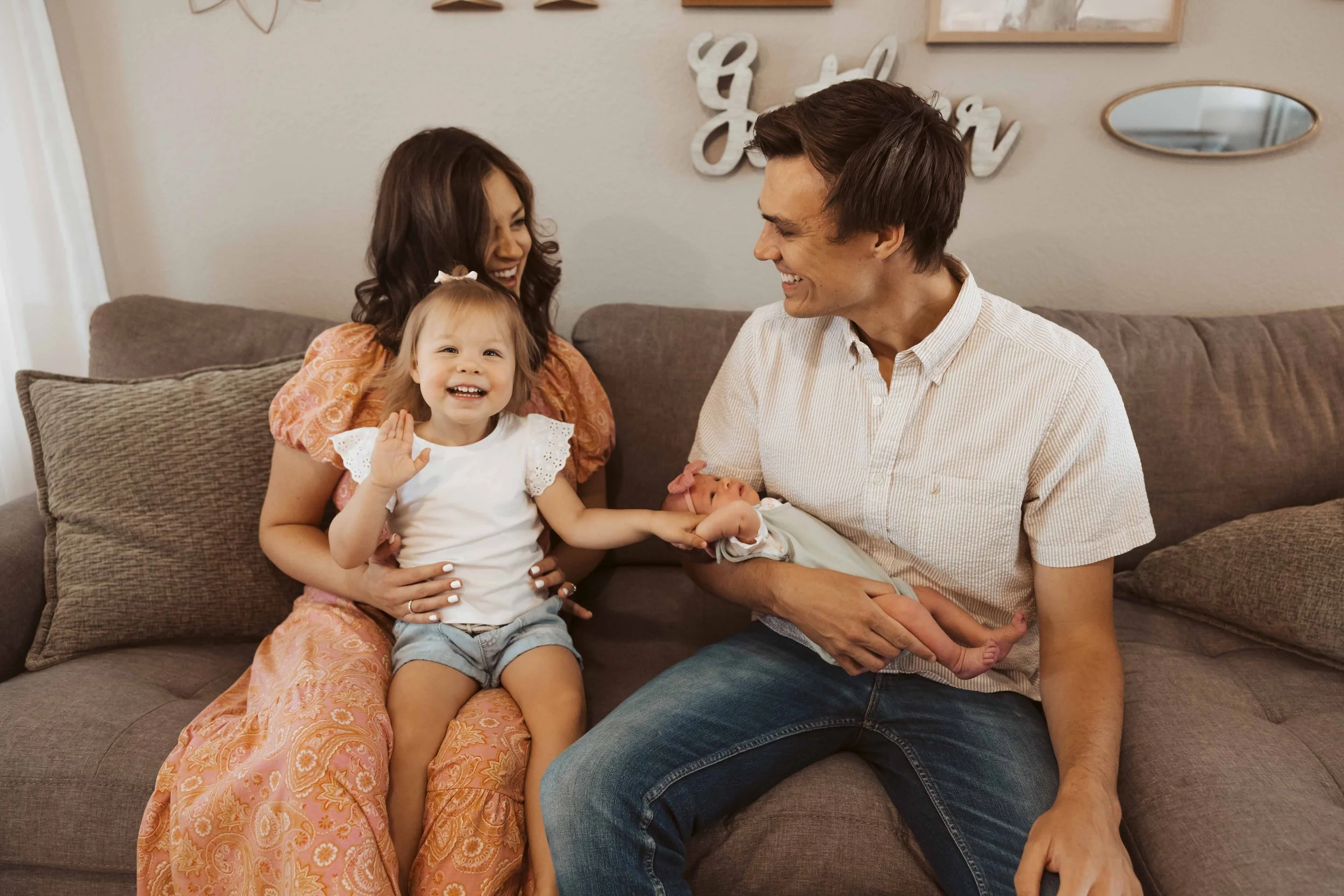 When baby Avery arrived in July, I headed to their Gilbert home for a morning session. And honestly? Addie stole the show. This girl has the biggest smile, and every time I see her, she's full of laughter. She probably gets that from her mom—Mallory's the same way.